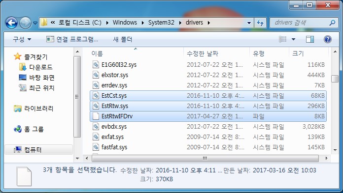 - C:\Windows\system32\drivers Æú´õ ³» "EstRtw.sys", "EstCst.sys", "EstRtwlFDrv" ÆÄÀÏ Áß Á¸ÀçÇÏ´Â ÆÄÀÏ »èÁ¦