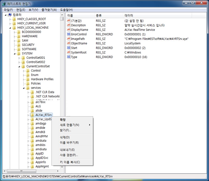 - HKEY_LOCAL_MACHINE\SYSTEM\CurrentControlSet\services\ALYac_RTSrv