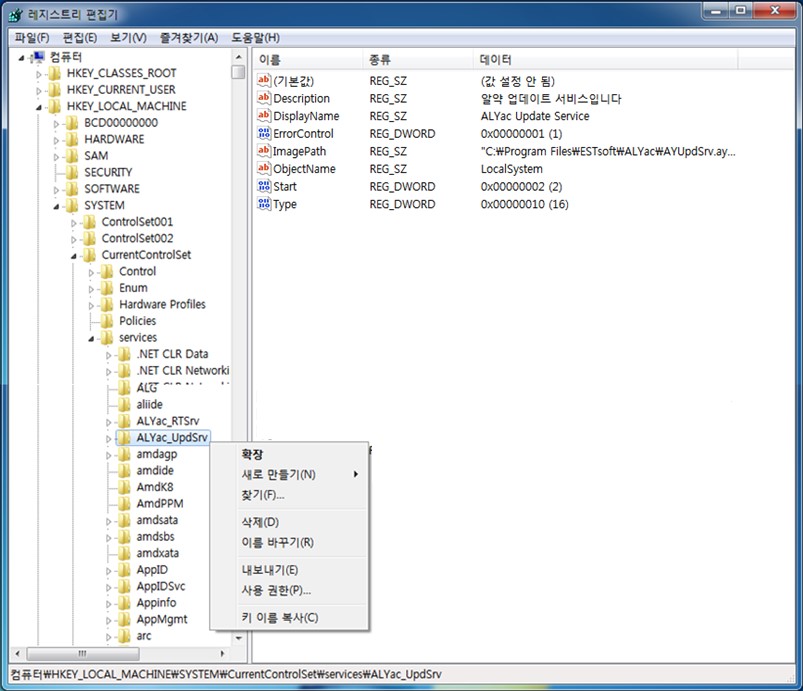 - HKEY_LOCAL_MACHINE\SYSTEM\CurrentControlSet\services\ALYac_UpdSrv